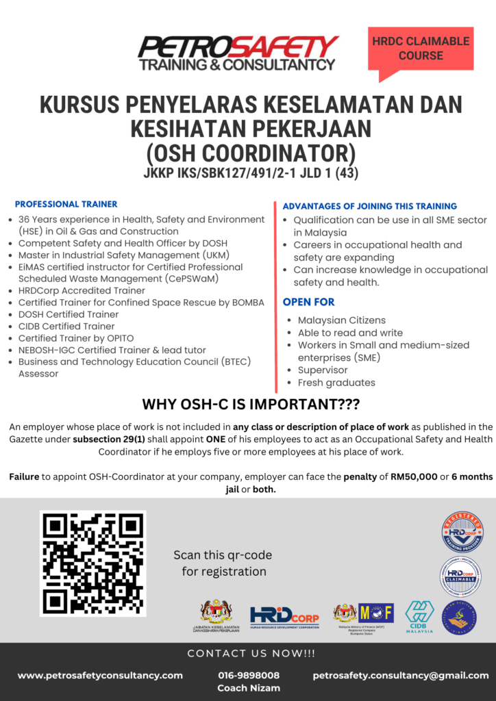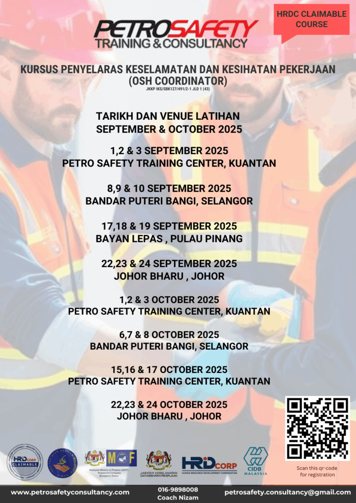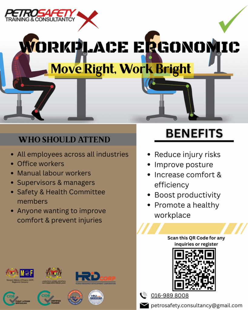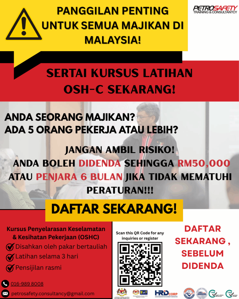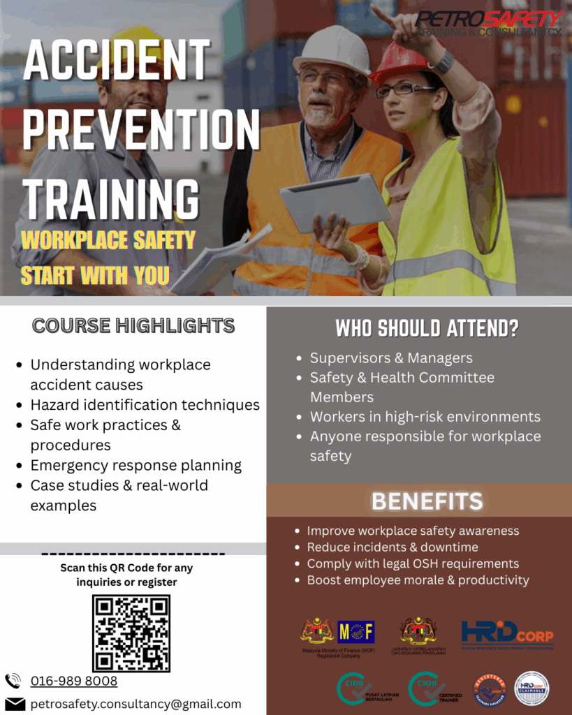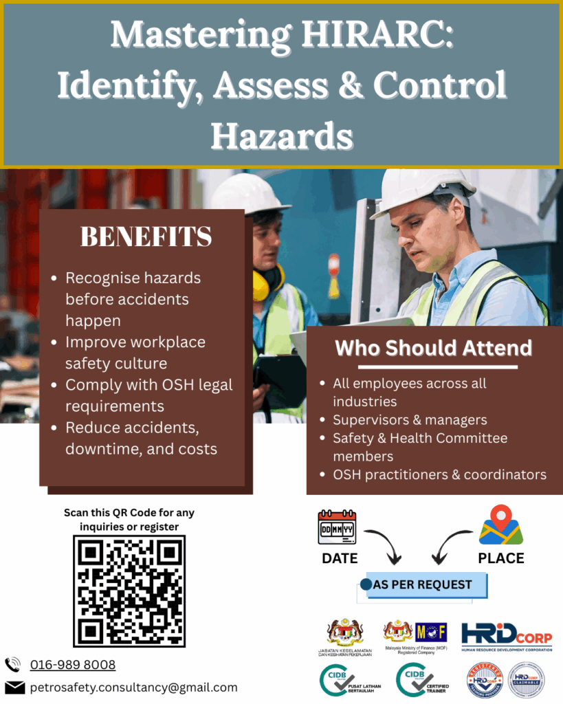course is designed to help employers and employees actively participate in maintaining a safe and healthy working environment. Based on the Occupational Safety and Health Act 1994, this course emphasizes the shared responsibility of both employers and employees in managing workplace safety and health risks.